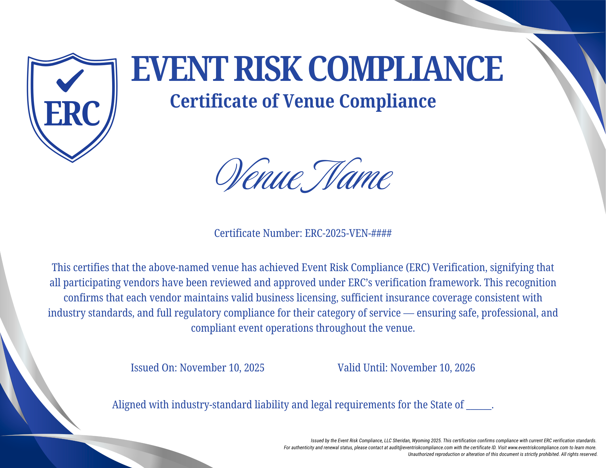 Your space sets the tone, defines the experience, and carries the ultimate responsibility for safety and compliance. By joining Event Risk Compliance (ERC), your venue gains access to verified, insured vendors, simplified compliance tracking, and a network built around accountability and trust. We help Venues protect their reputation, reduce liability, and ensure every partner working on your property meets professional and legal standards. Because when your venue is ERC Verified, every event runs smoother, safer, and stronger.